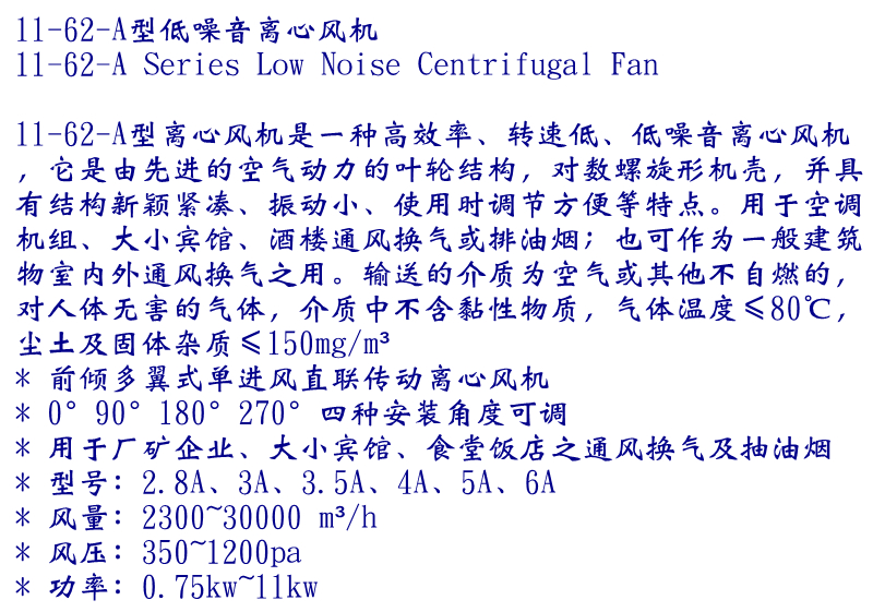 11-62-A式多翼式離心通風(fēng)機(jī),它是由先進(jìn)的空氣動(dòng)力的葉輪結(jié)構(gòu),對(duì)數(shù)螺旋形機(jī)殼,并具有結(jié)構(gòu)新穎緊湊、振動(dòng)小、使用時(shí)調(diào)節(jié)方便等特點(diǎn)。用于空調(diào)機(jī)組、大小賓館、酒樓通風(fēng)換氣或排油煙;